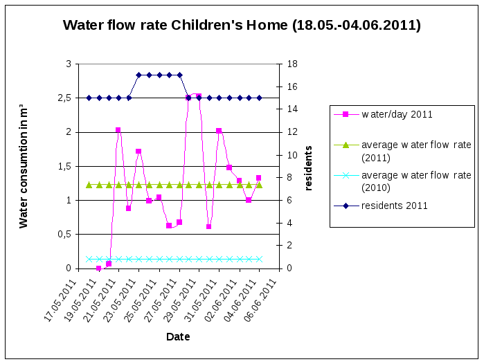 The wastewater production fluctuates significantly during the measurement period. As the water meter was installed at the overflow point of the PGF, rainwater collected in the PGF potentially changes the measured quantity. However, neither rain nor changes in the residents’ numbers explain these fluctuations. There was rainfall on May 24th and 25th, 2011 but at these days the water flow rate was low. Two additional residents have also no visible impact on the water consumption. The average of the water used every day is 1.23m3. In August 2010 an average water consumption of 0.14 m3 /day was measured. In this period, 20 to 26 persons lived in Children’s Home resulting in less water used by more people. Considering that in Germany one person uses 130 l water per day, it seems to be not realistic that 26 people in Lesotho use all together almost the same quantity. A failure in the measurements – or data recording or interpretation - of 2010 should be assumed.