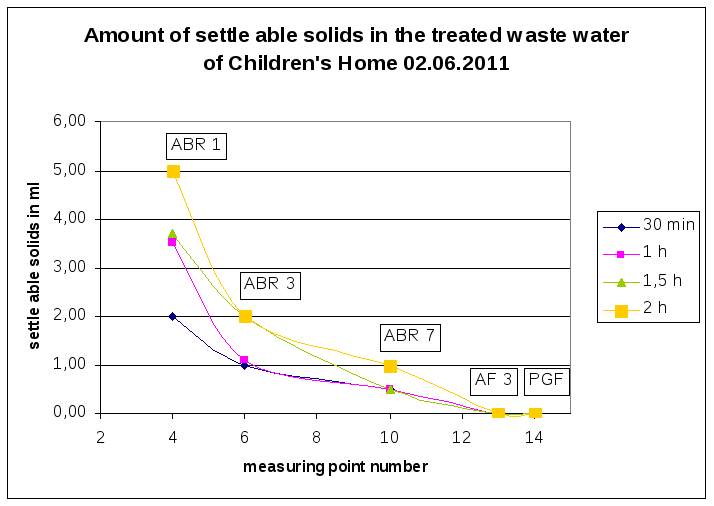The diagram of the settle able solids shows clearly that the amount of settle able solids reduces with every treatment step. In the last chamber of the Anaerobic Filter and in the PGF effluent no more settle able solids were found in the treated water. Blockages in the filter because of particles in the treated wastewater can therefore be excluded.