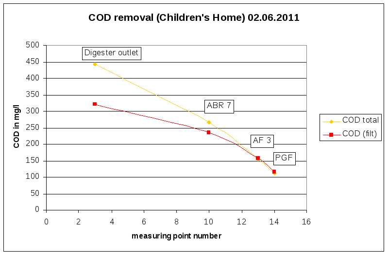 COD analysis on the 1st of September 2010 has resulted in much higher values; the water sample taken in 2010 at the effluent of the PGF showed even a higher COD than the COD measured in 2011 at the digester outlet. The PGF effluent quality measured in 2011 is in the range of the wastewater standards established by the German Government, which limits the COD for percolated water under 200 mg/l. The effluent COD measured at the Biogas/DEWATS at Children’s Home on June 2nd 2011 is 111 mg/l. In 2010 COD reduction took mainly place in the PGF; in 2011, the reduction occurs more continuously throughout the system.